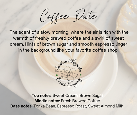 Coffee Date - Smooth, creamy coffee with undernotes of cinnamon, vanilla, and a touch of milk.