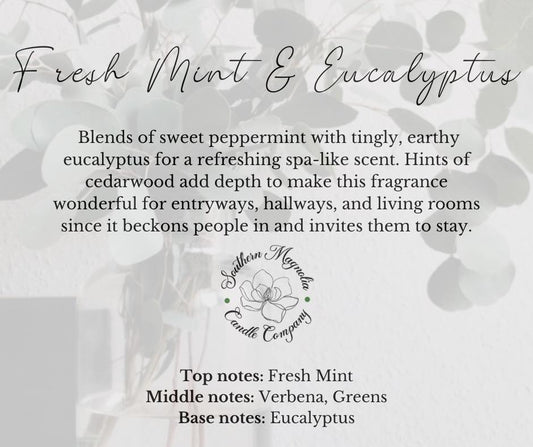 Fresh Mint & Eucalyptus - Blends of sweet peppermint with tingly, earthy eucalyptus for a refreshing spa-like scent. Hints of cedarwood add depth to make this fragrance wonderful for entryways, hallways, and living rooms since it beckons people in and invites them to stay.
