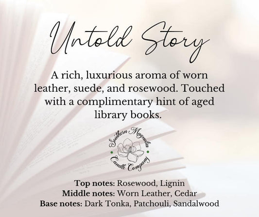 Untold story - A rich, luxurious aroma of worn leather, suede, and rosewood. Touched with a complimentary hint of aged library books.