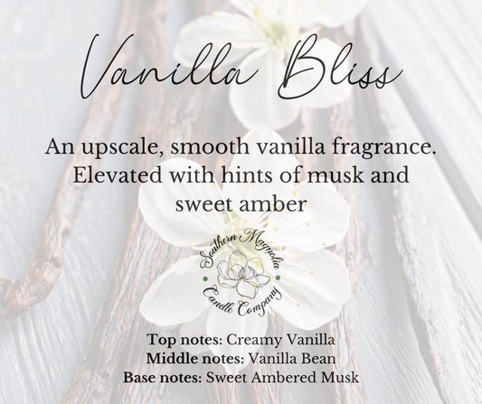 Vanilla Bliss - An upscale, smooth vanilla fragrance. Elevated with hints of musk and sweet amber.