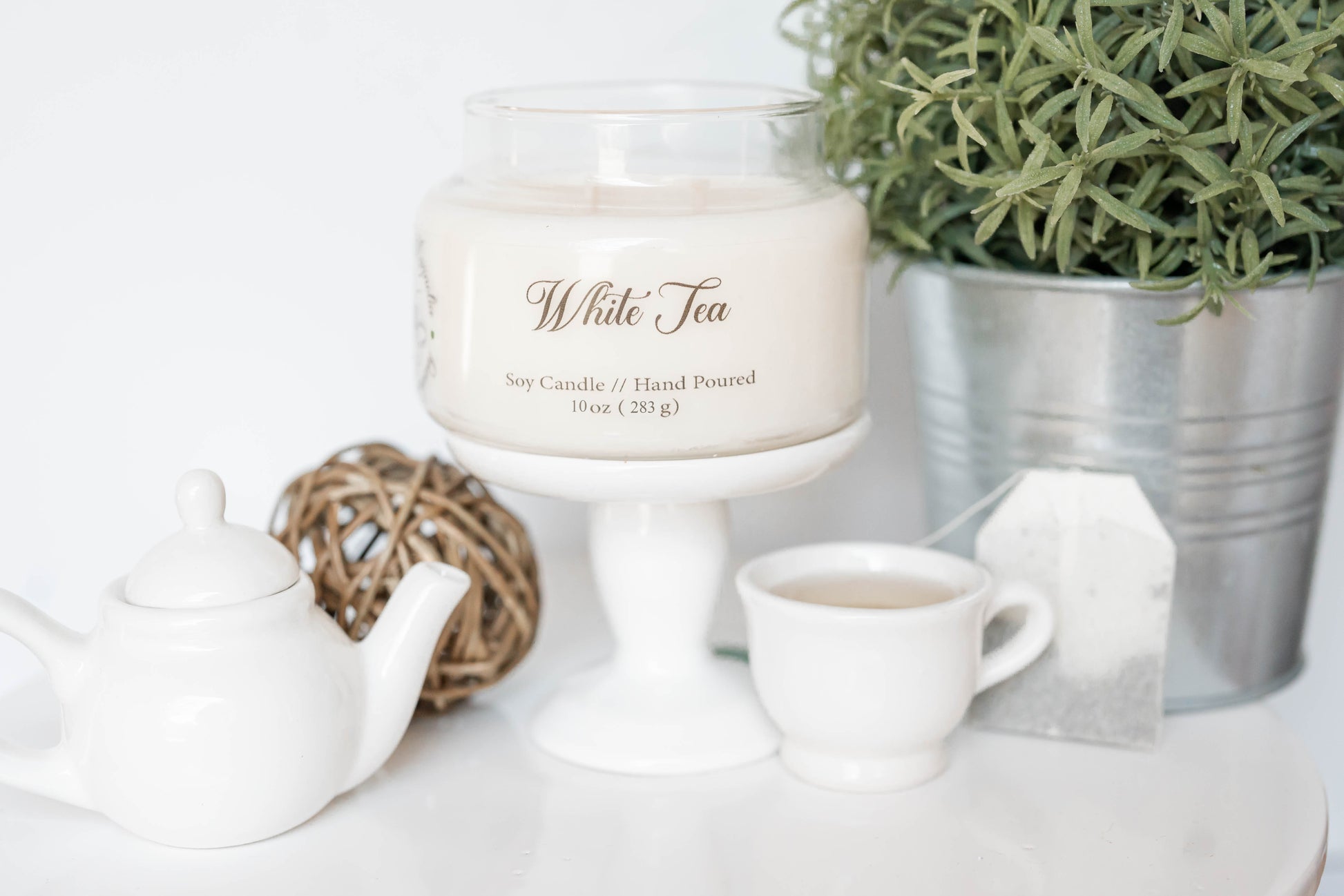 White Tea - Deeply aromatic, this scent begins with top notes of mandarin and lemongrass amplified by mid notes of bergamot and ginger steeped in a base of white tea and jasmine. Uplifting and ethereal, this scent transforms any space into a soothing atmosphere.